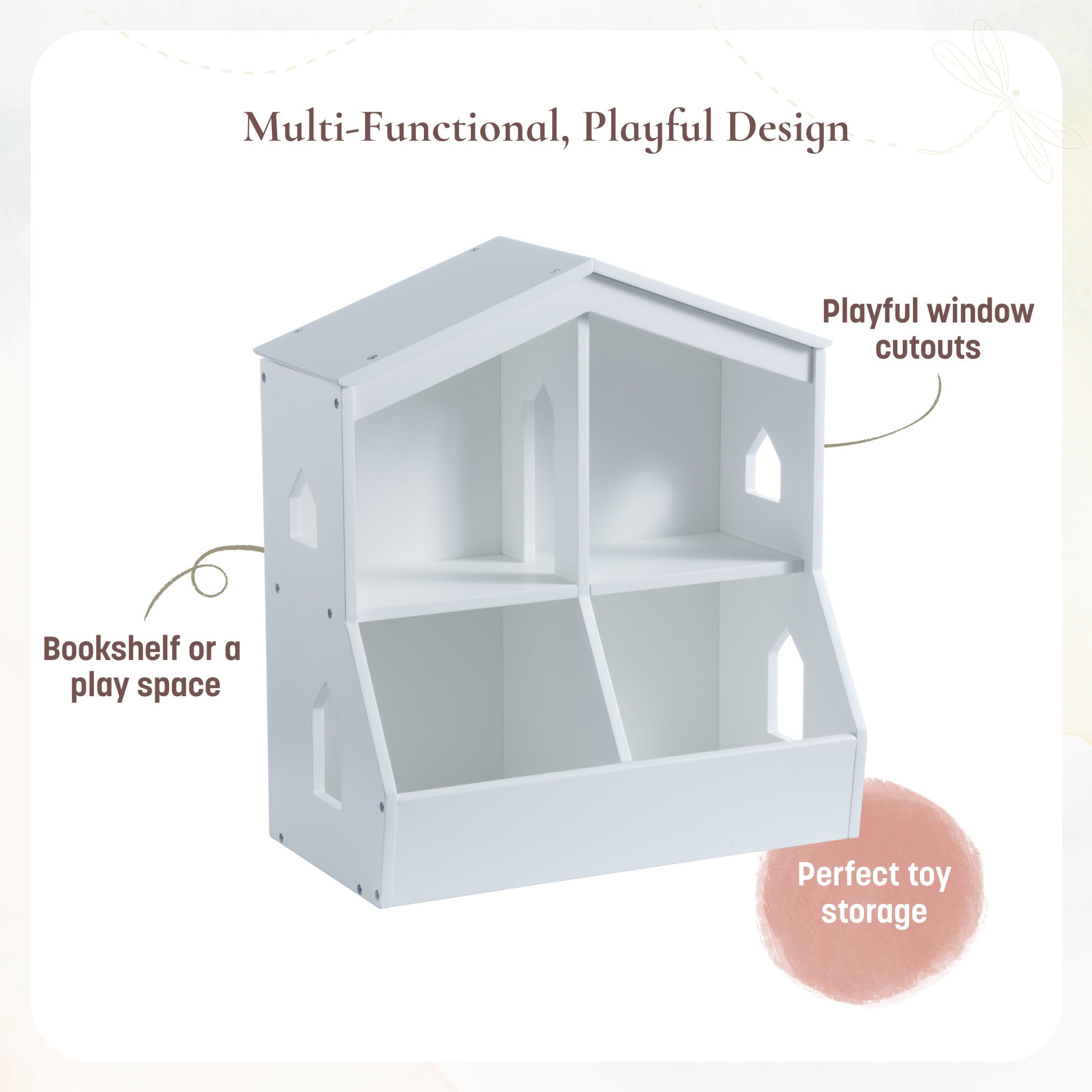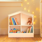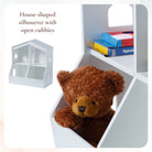 The playful, multi-functional design of the Little Seeds Trellis Storage Cubby Bookcase doubles as an imaginative play space and storage area. Its charming house-shaped silhouette features open cubbies that inspire creativity and help keep toys organized, while the playful window cutouts add a touch of whimsey.