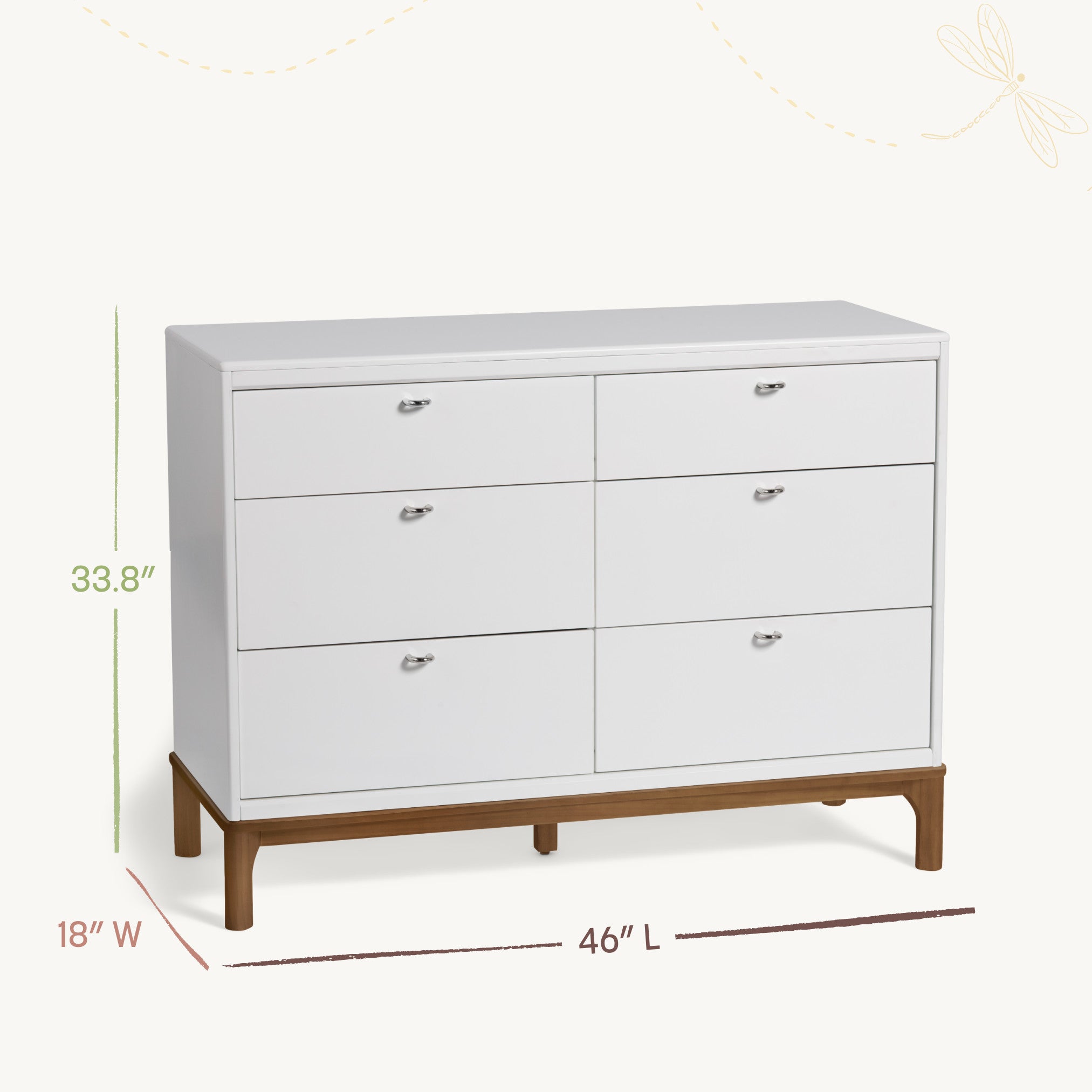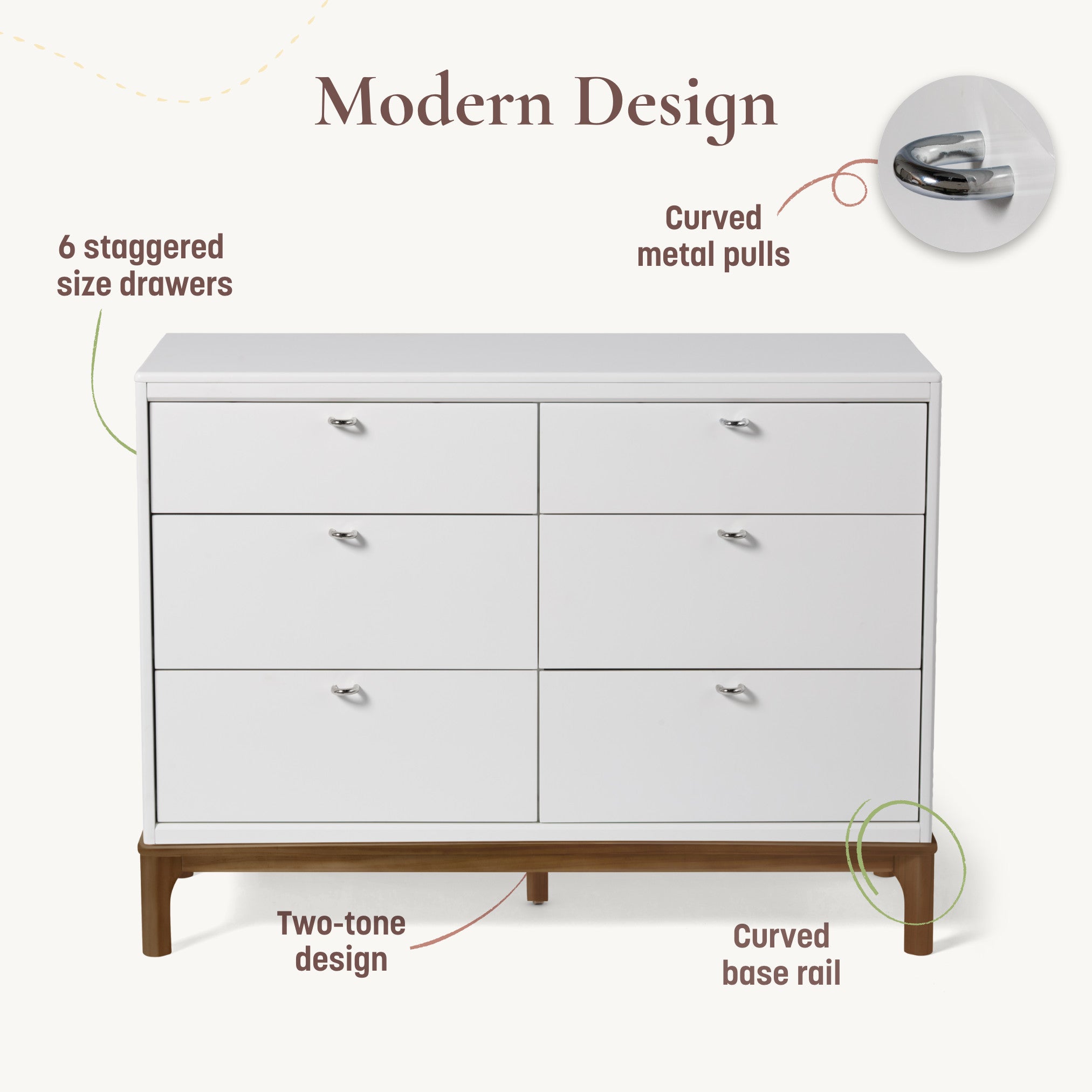The Little Seeds Laurel 6-Drawer Dresser brings a timeless style and everyday practicality to your nursery or bedroom with the curved posts and base rails that highlight the dresser’s Soft Modern aesthetic. The curved metal pulls add a special touch. And the rounded edges and beveled framing echo the coordinating Laurel 4-in-1 Convertible Crib, creating an easy, stylish space.
